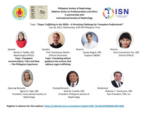 The Philippine Society of Nephrology (PSN) started a webinar series on ethics and professionalism in November 2020. In the seventh session of the series, held on July 28, 2021, the topic was “Organ Trafficking in the 2020s – A Persisting Challenge for Transplant Professionals.” The ISN graciously agreed to co-host this event and Dr. Agnes Fogo gave the opening remarks. This is a particularly relevant topic for the organization because the Philippines was declared an organ trafficking hotspot by the WHO in 2007. Since then, the PSN has been on the forefront of promoting ethical practices in transplantation.